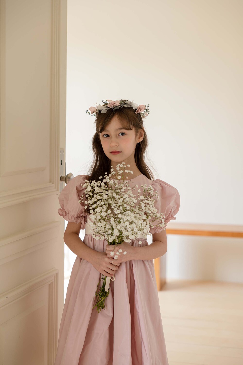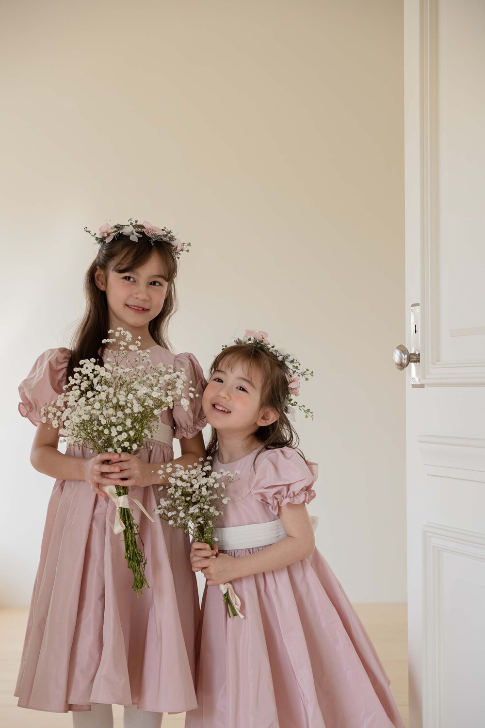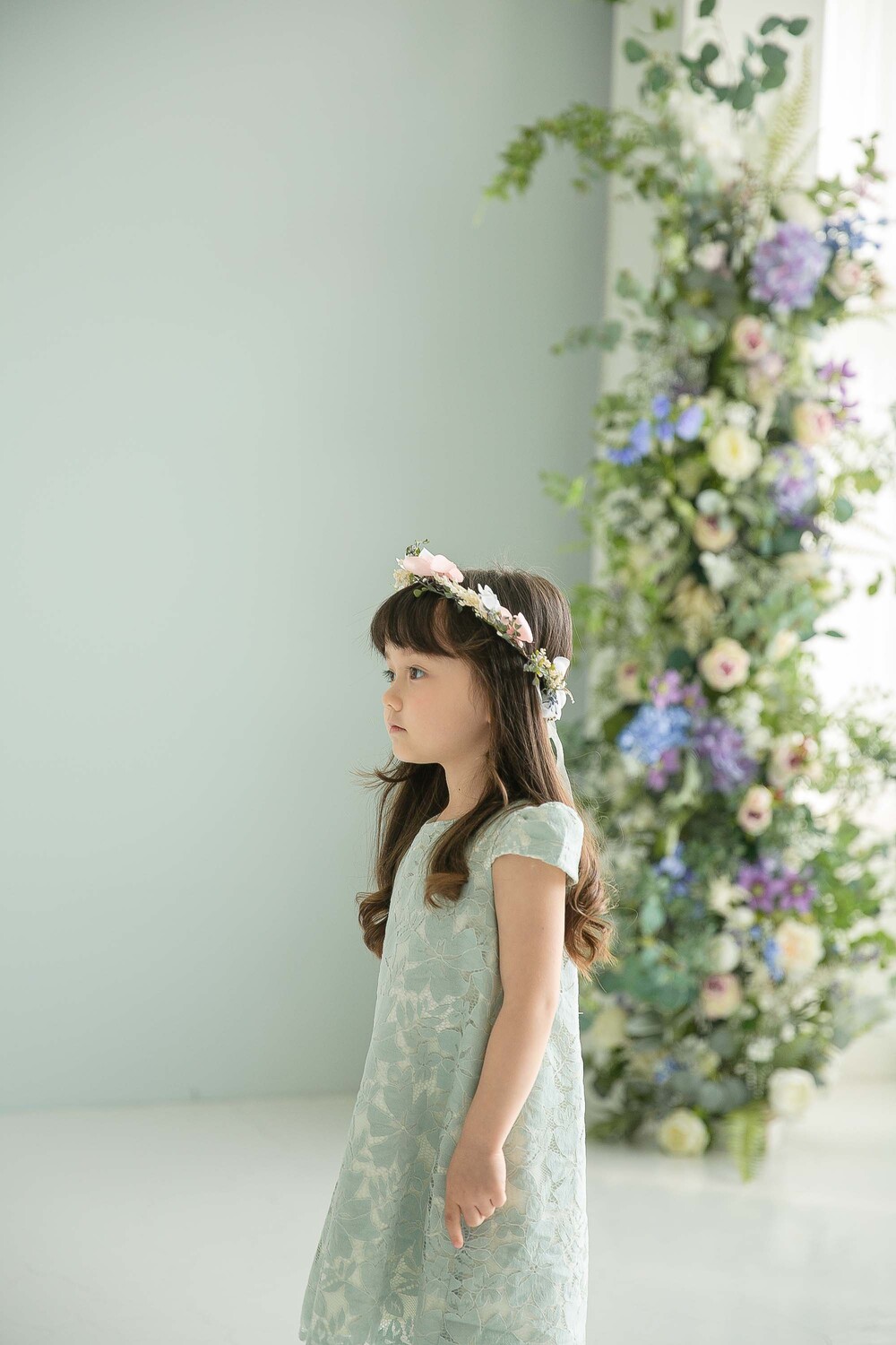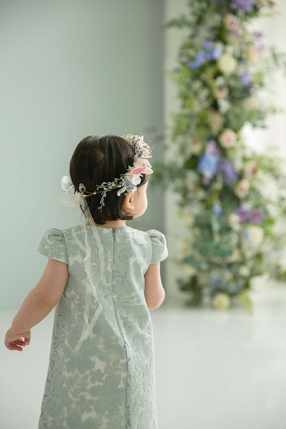 톤다운된 핑크와 그린 컬러가 드레스의 무드를 더해주는