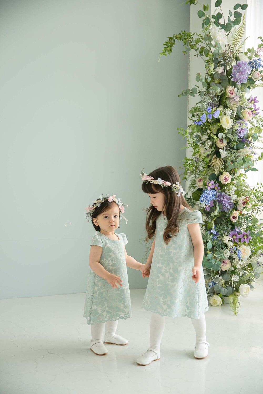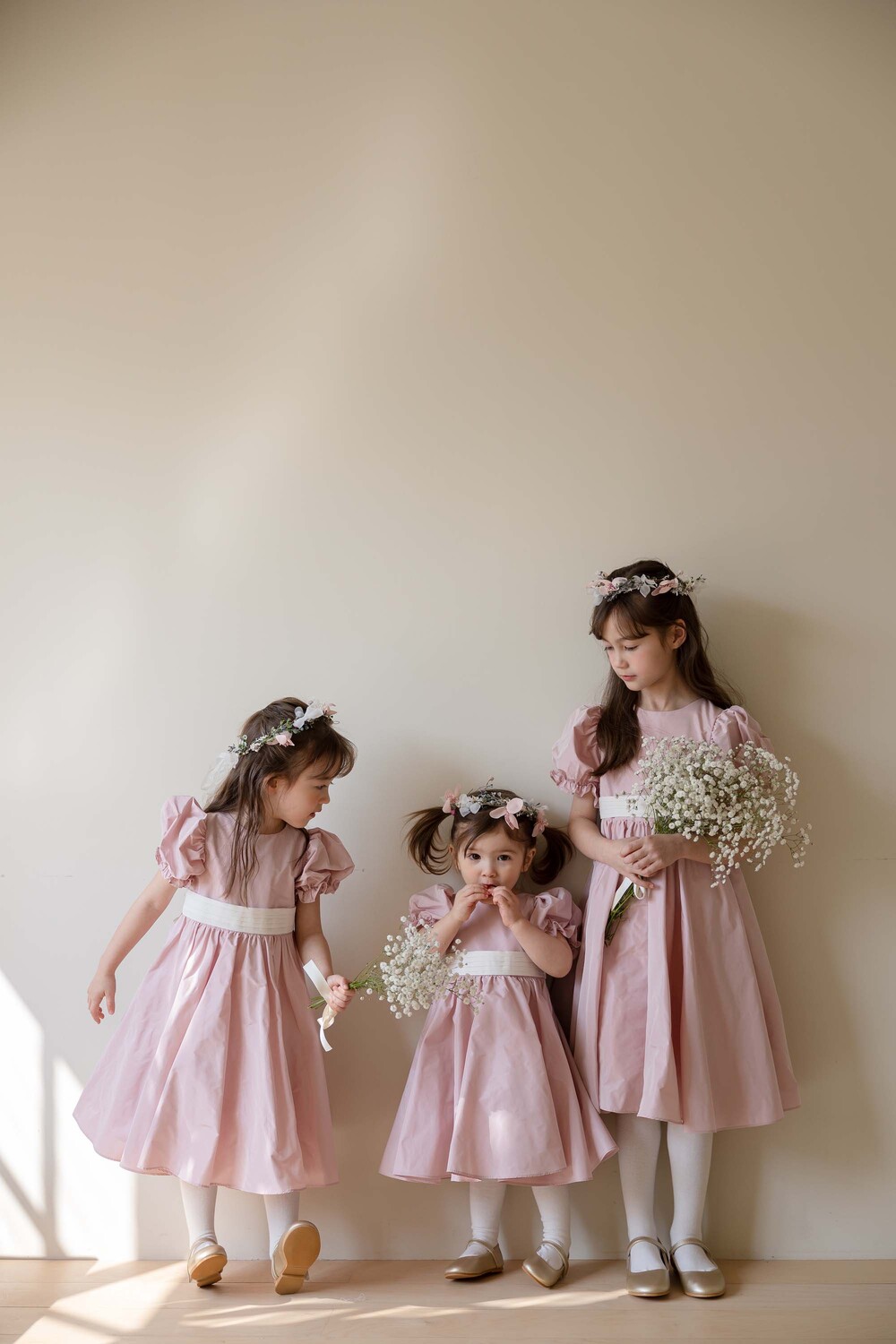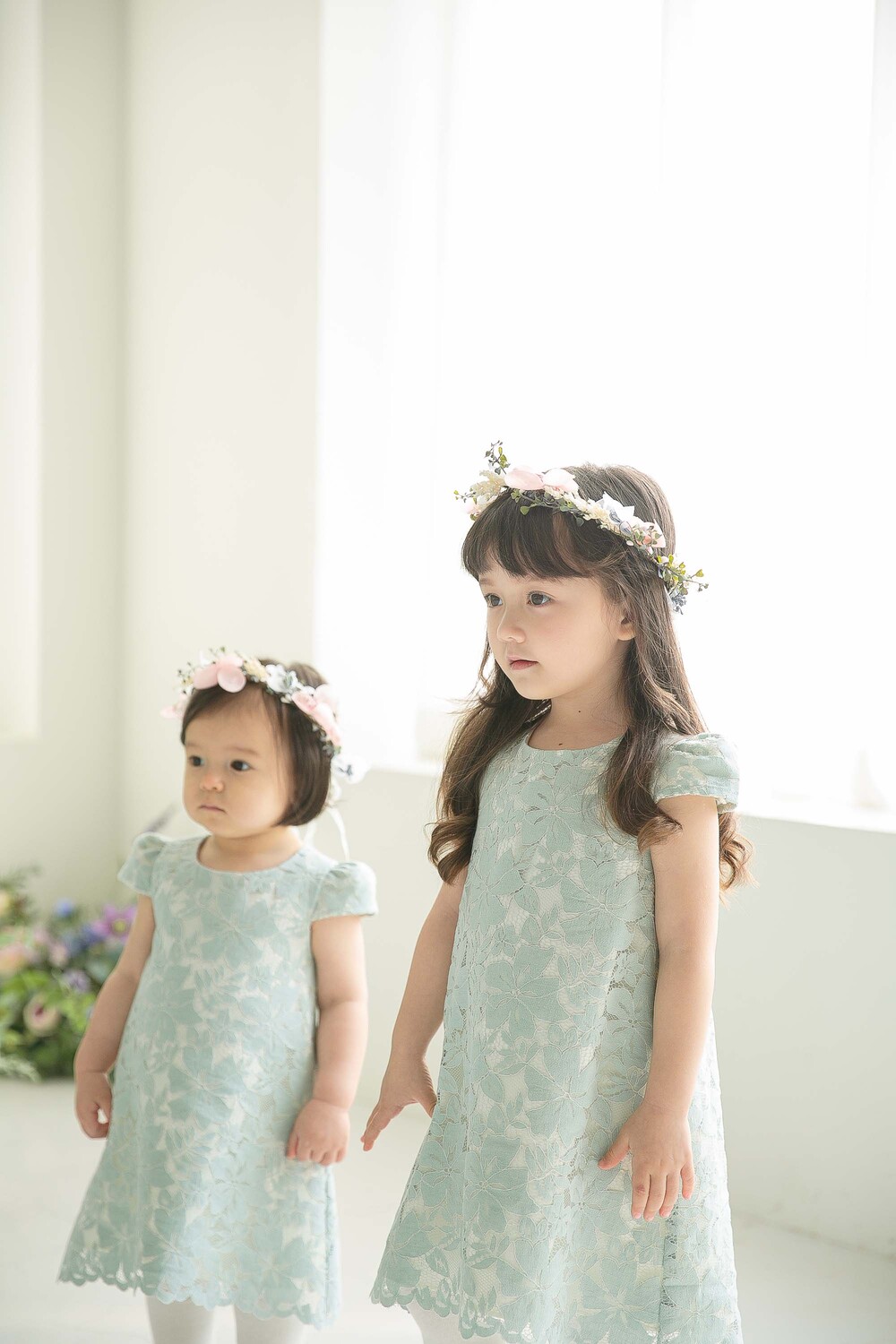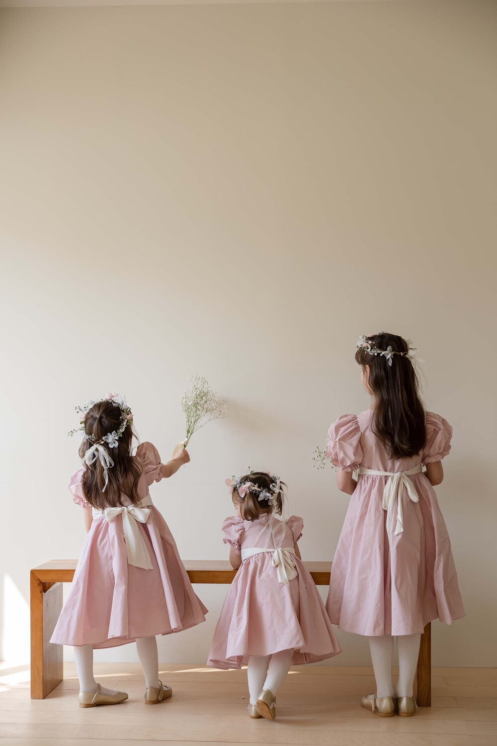 톤다운된 핑크와 그린 컬러가 드레스의 무드를 더해주는