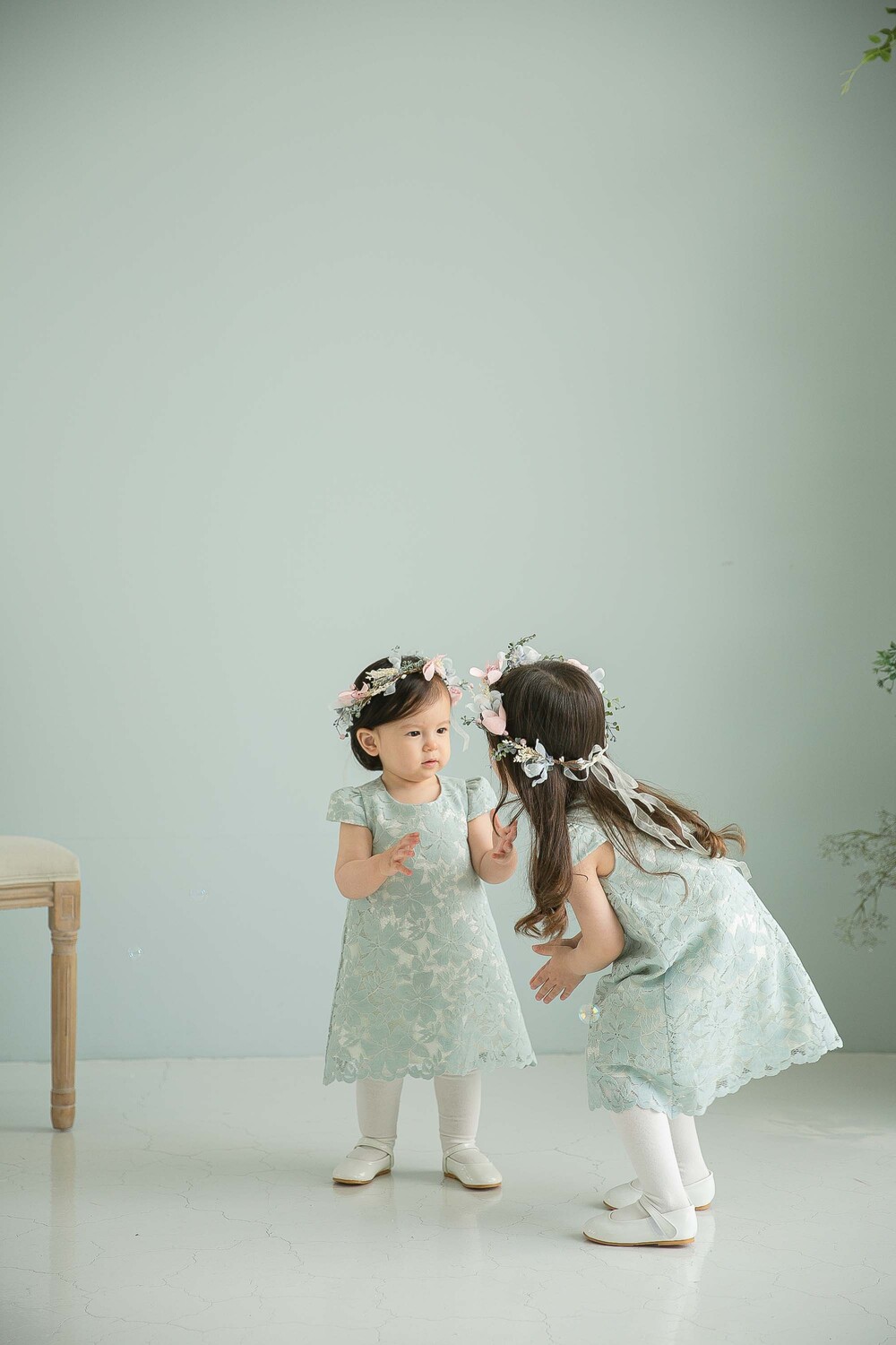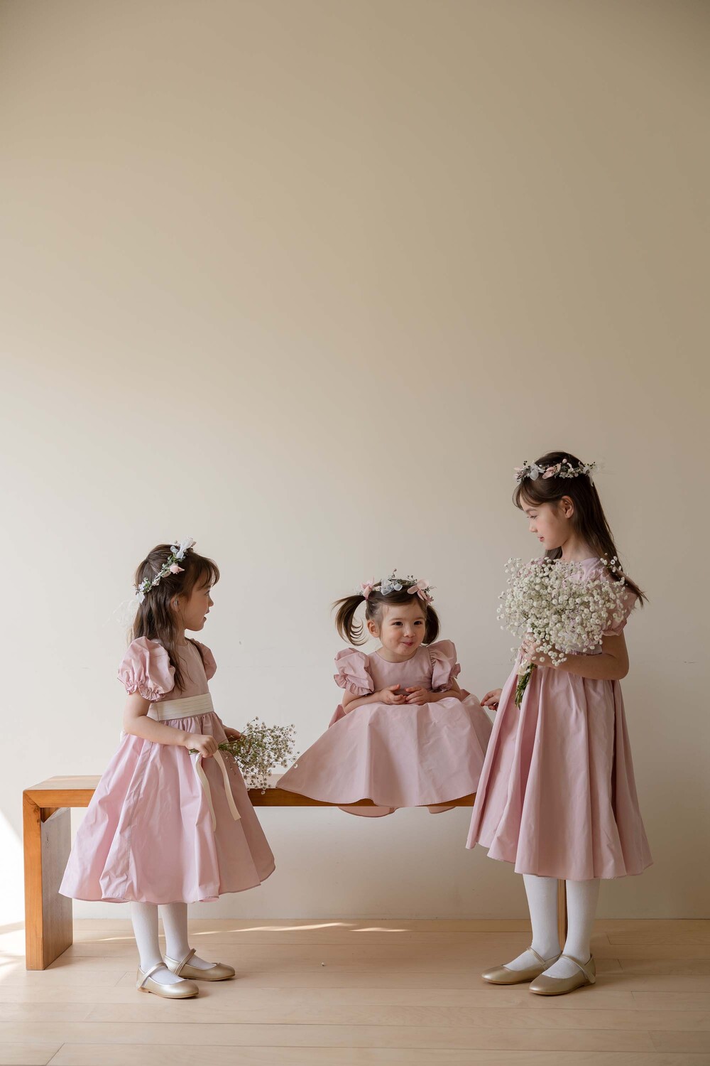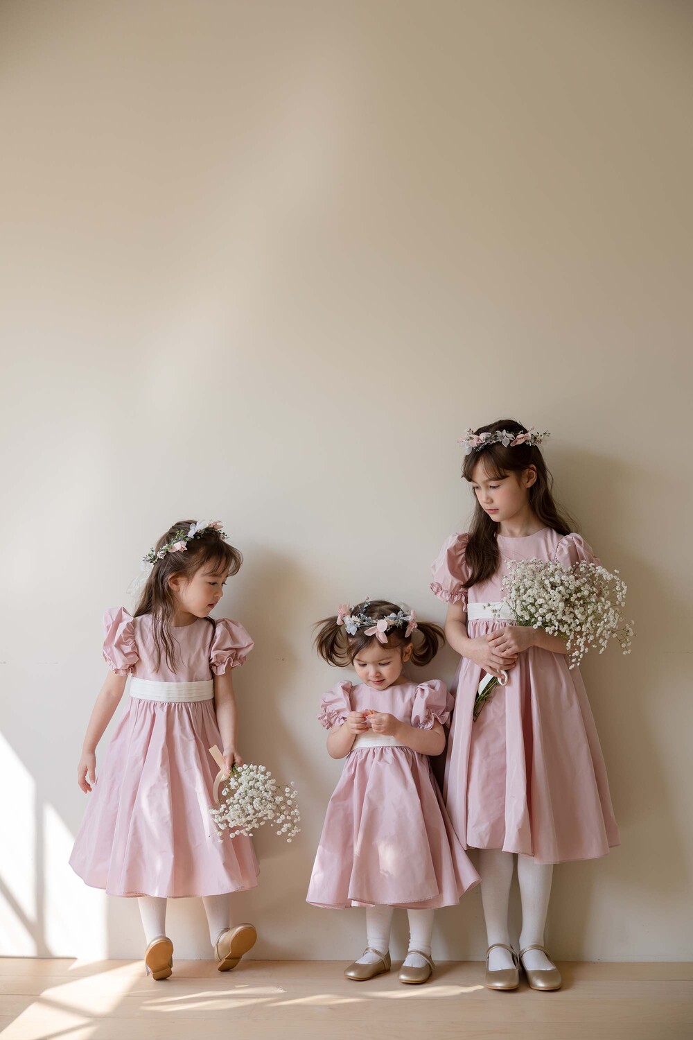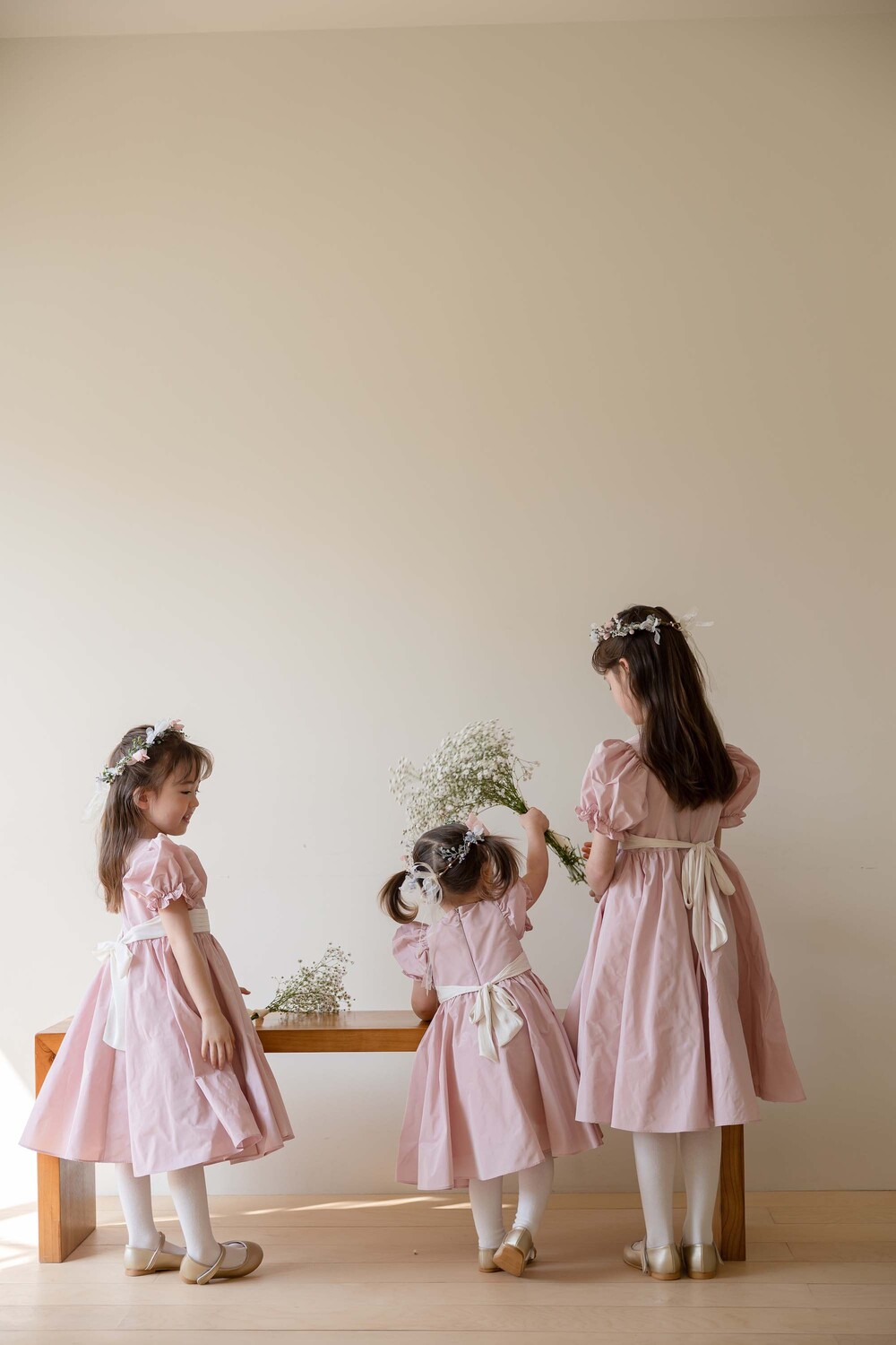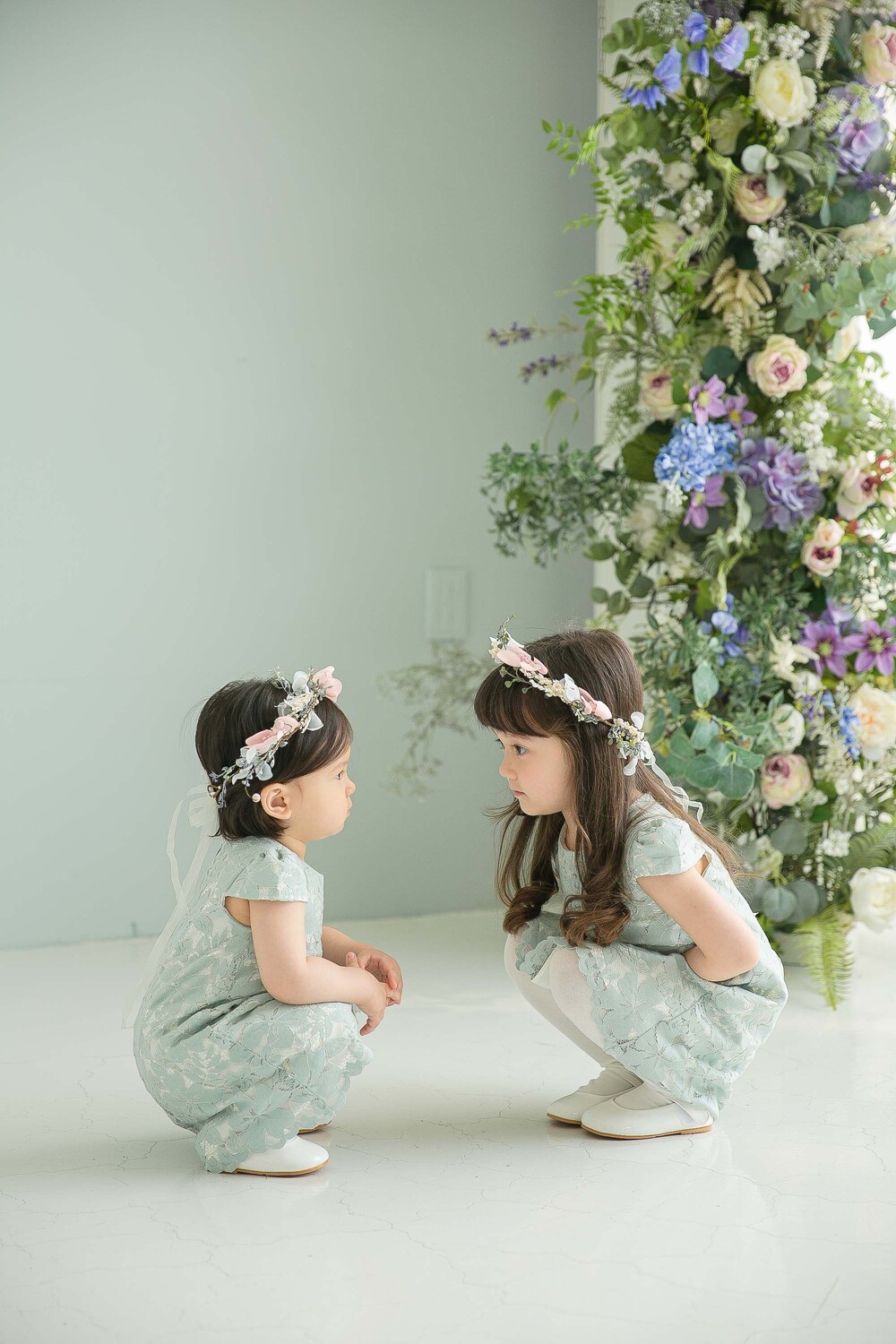 톤다운된 핑크와 그린 컬러가 드레스의 무드를 더해주는