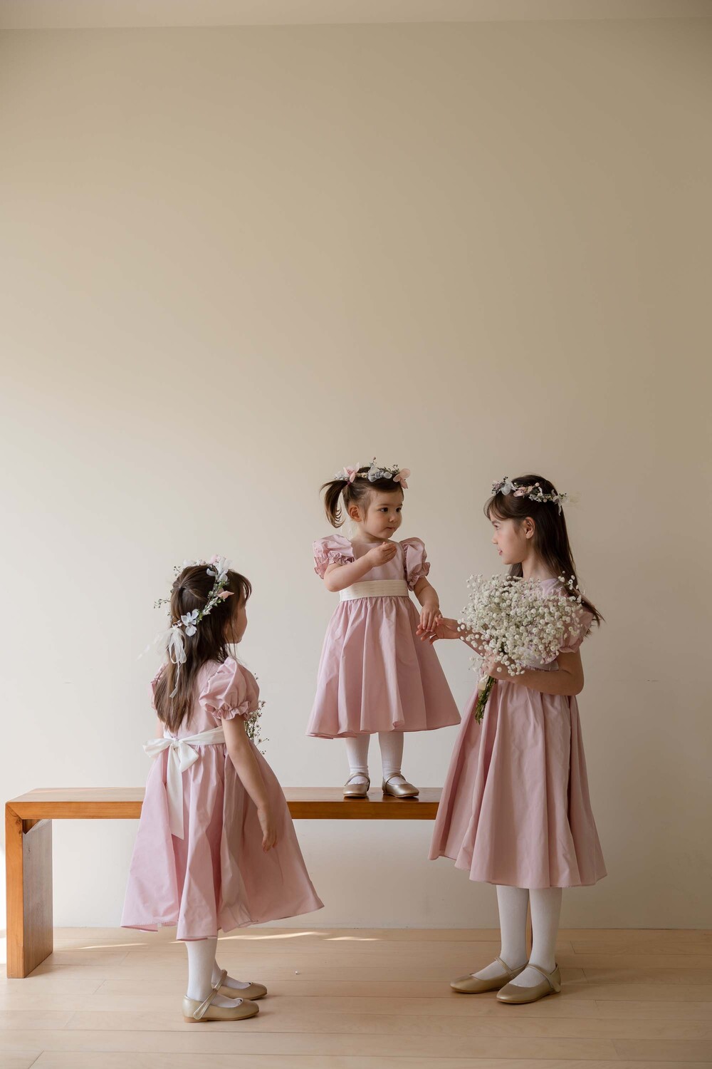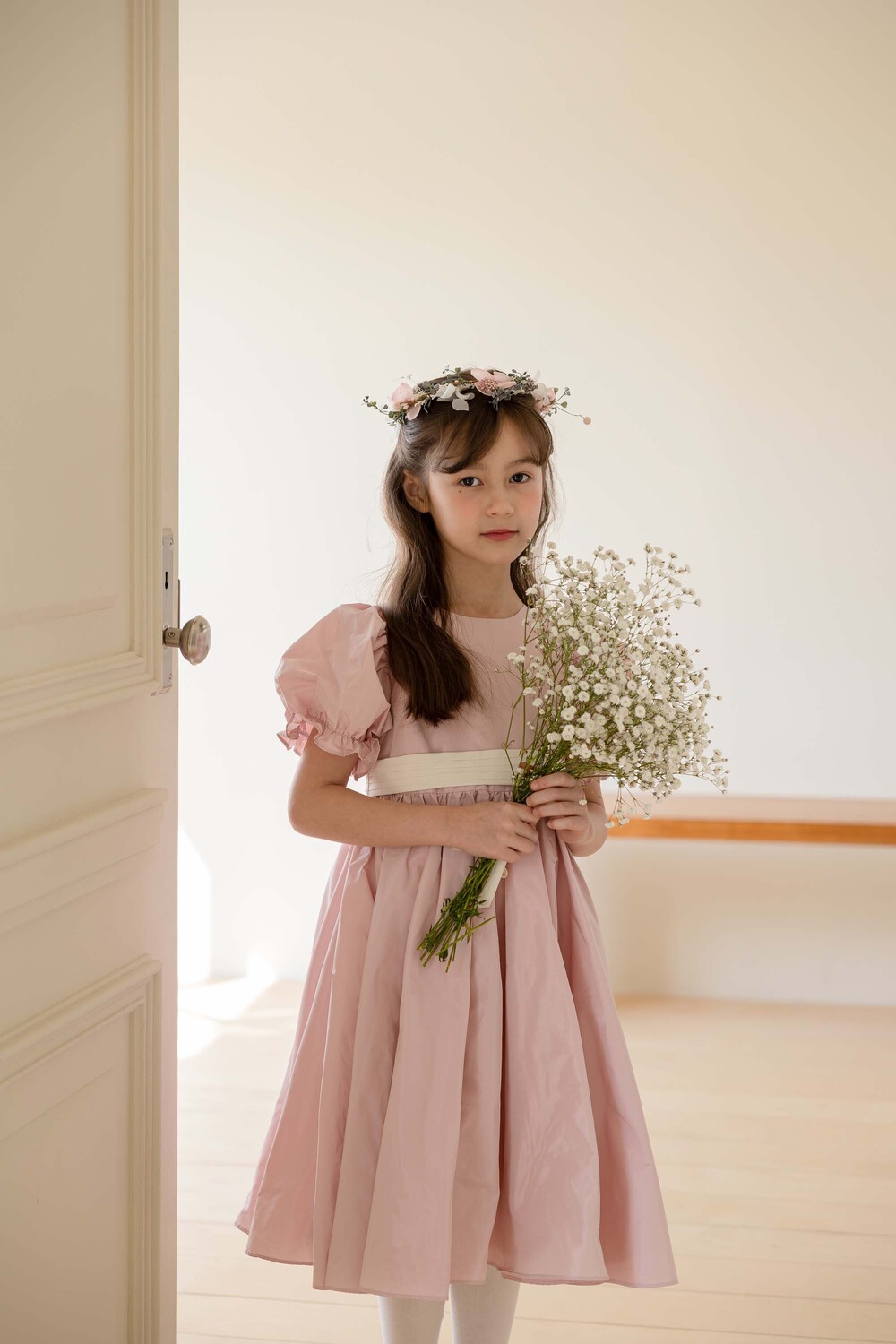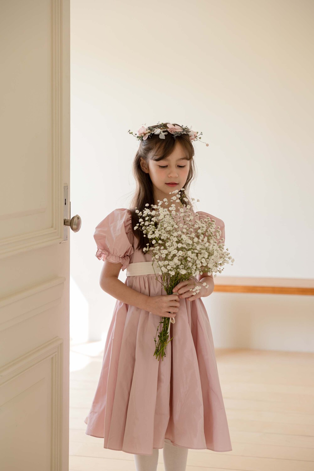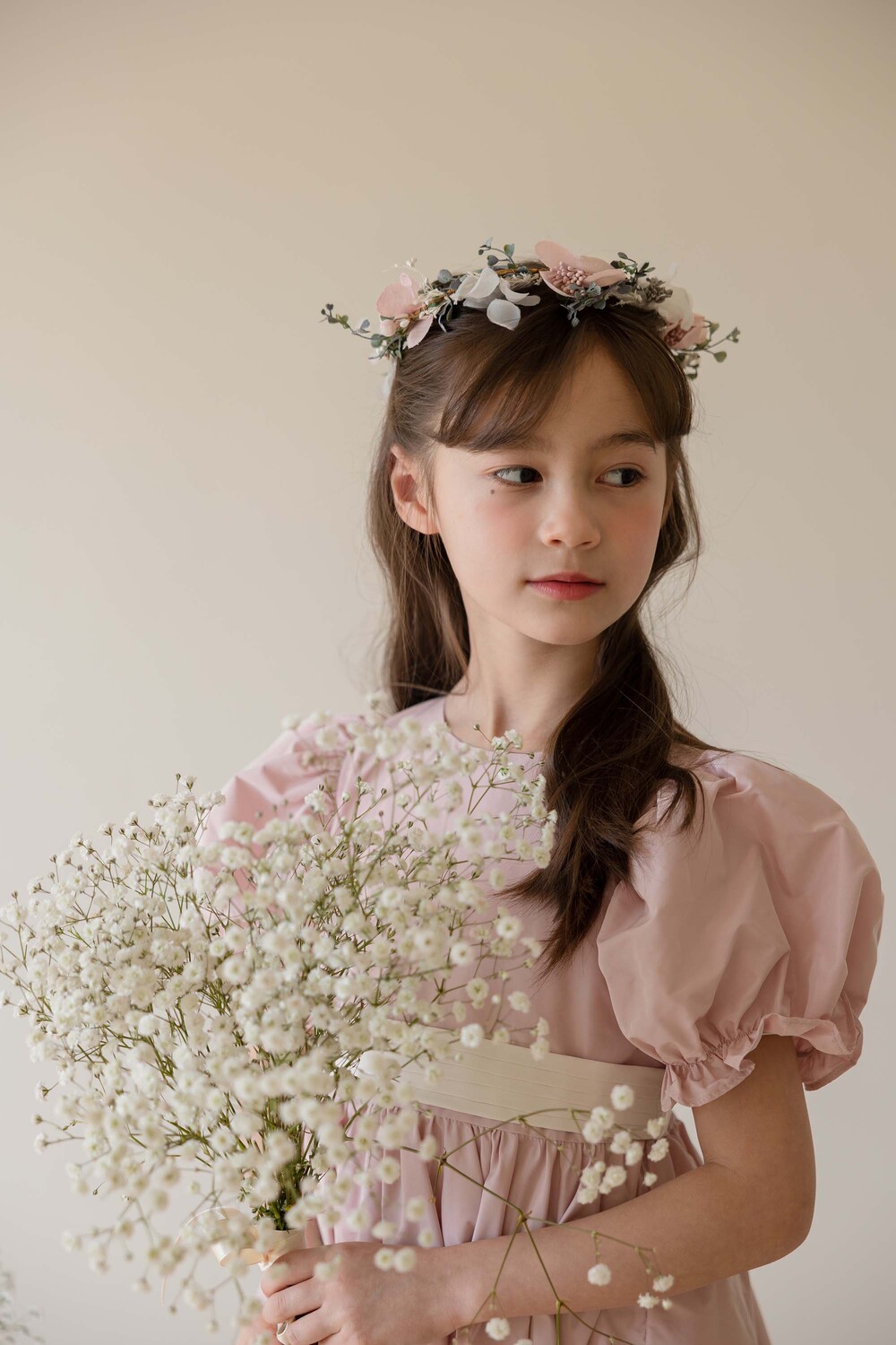 톤다운된 핑크와 그린 컬러가 드레스의 무드를 더해주는