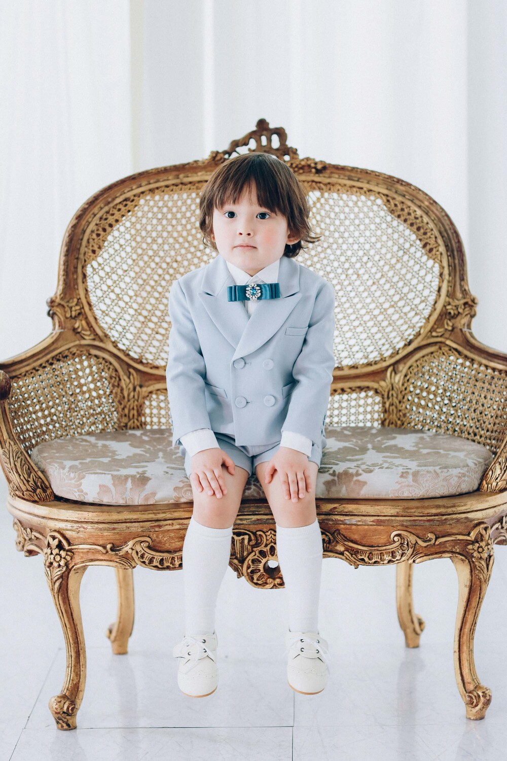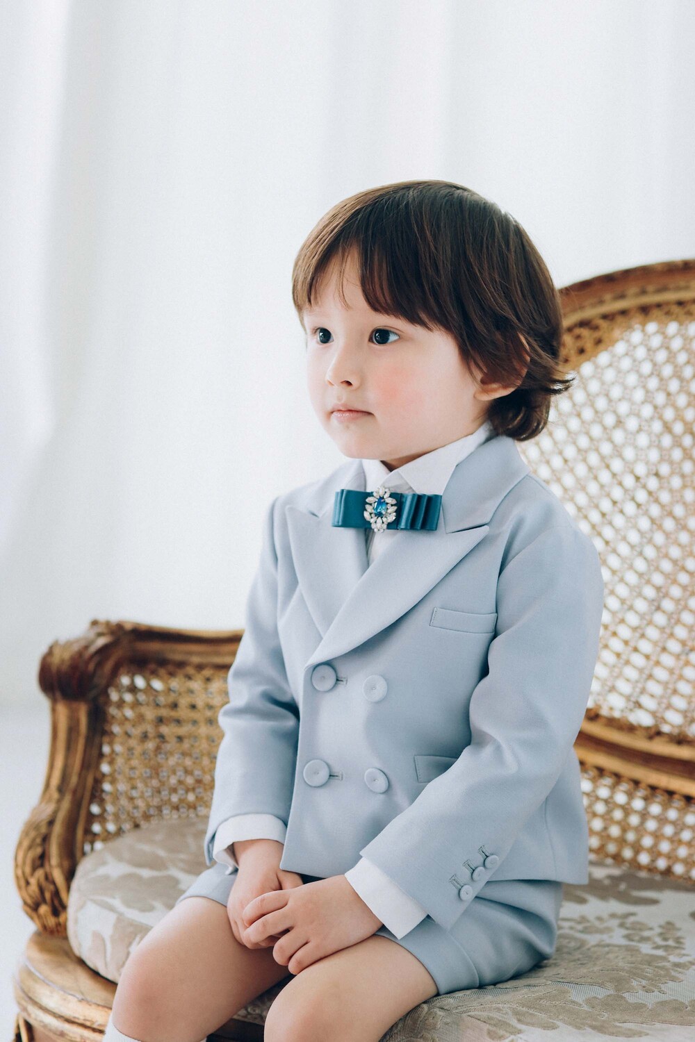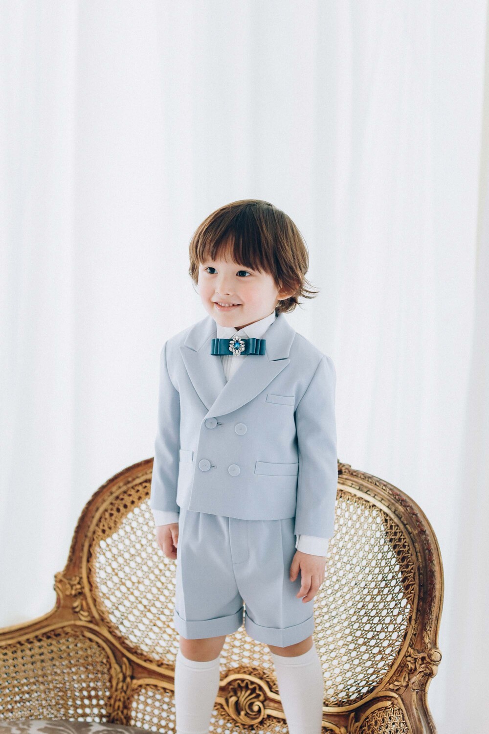 더블 버튼 재킷과 핀턱 하프팬츠로 단정하게 완성됩니다.