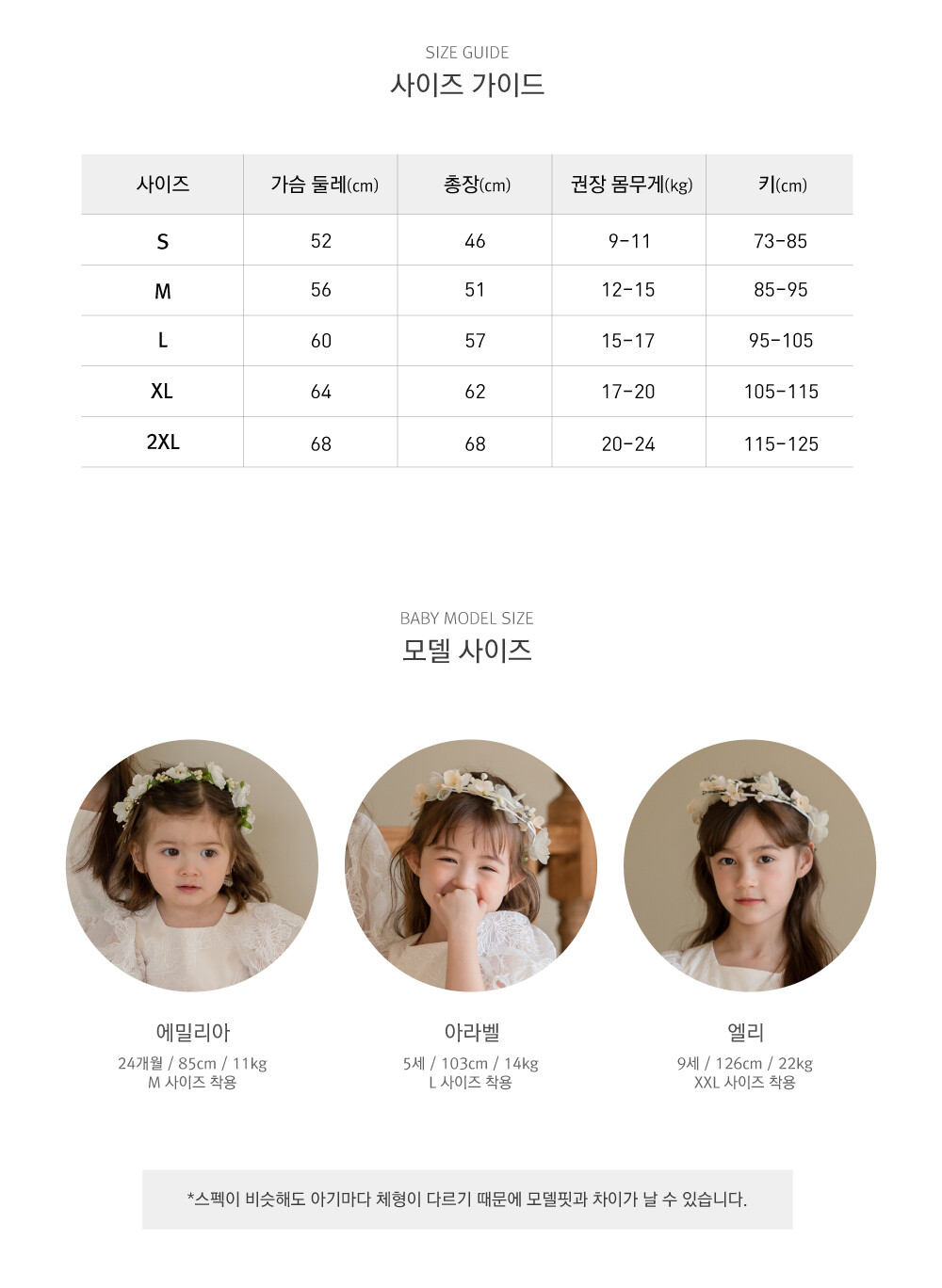 중간 사이즈의 경우, 한 사이즈 크게 입혀도 자연스럽고 예쁩니다.